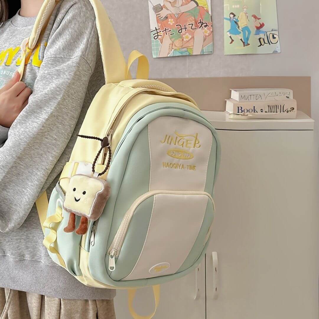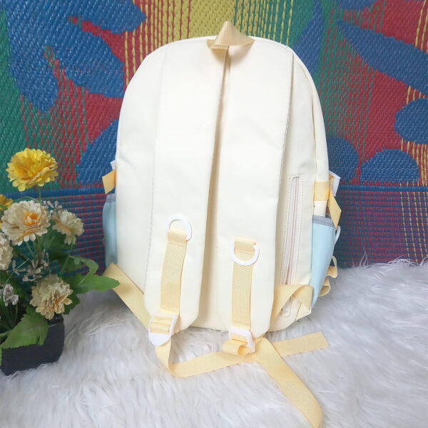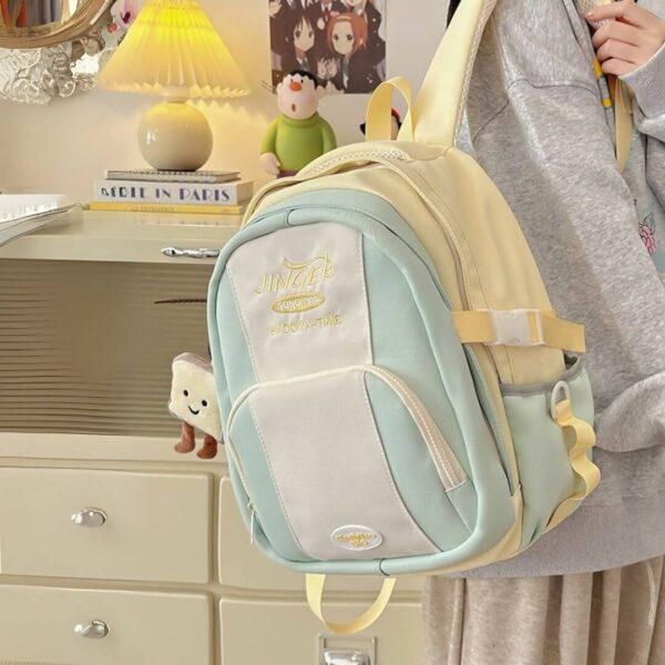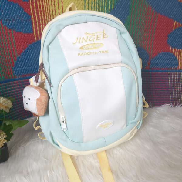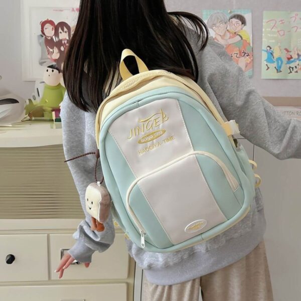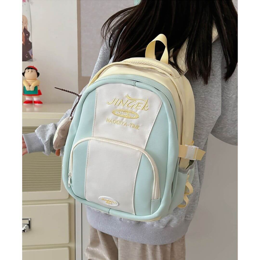 Dopamine Girl Backpack Size: 15.5 x 12 Inch Material: Nylon Waterproof- Yes Opening method: zipper 2 Main Party 1 Small part Laptop part: Yes Imported: China