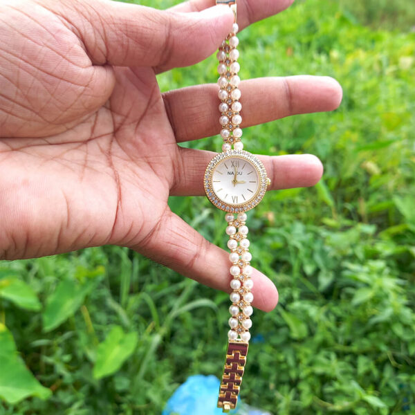 Rhinestone pearl strap watch Style: Fashion & Casual Belt Material: Metal Belt Length: 7.6 in Belt Width: 1 cm Dial Diameter: 1.5 x 1.5 cm Machine Warranty: 1 year